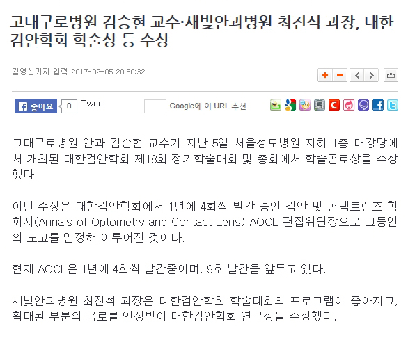 고대구로병원 김승현 교수·새빛안과병원 최진석 과장, 대한검안학회 학술상 등 수상 (메디컬월드뉴스 2017-02-05)