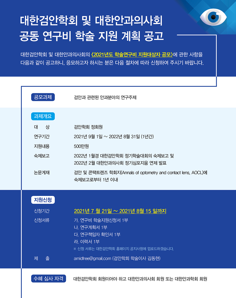 2021 대한검안학회 및 대한안과의사회 공동 연구비 학술 지원 계획 공고