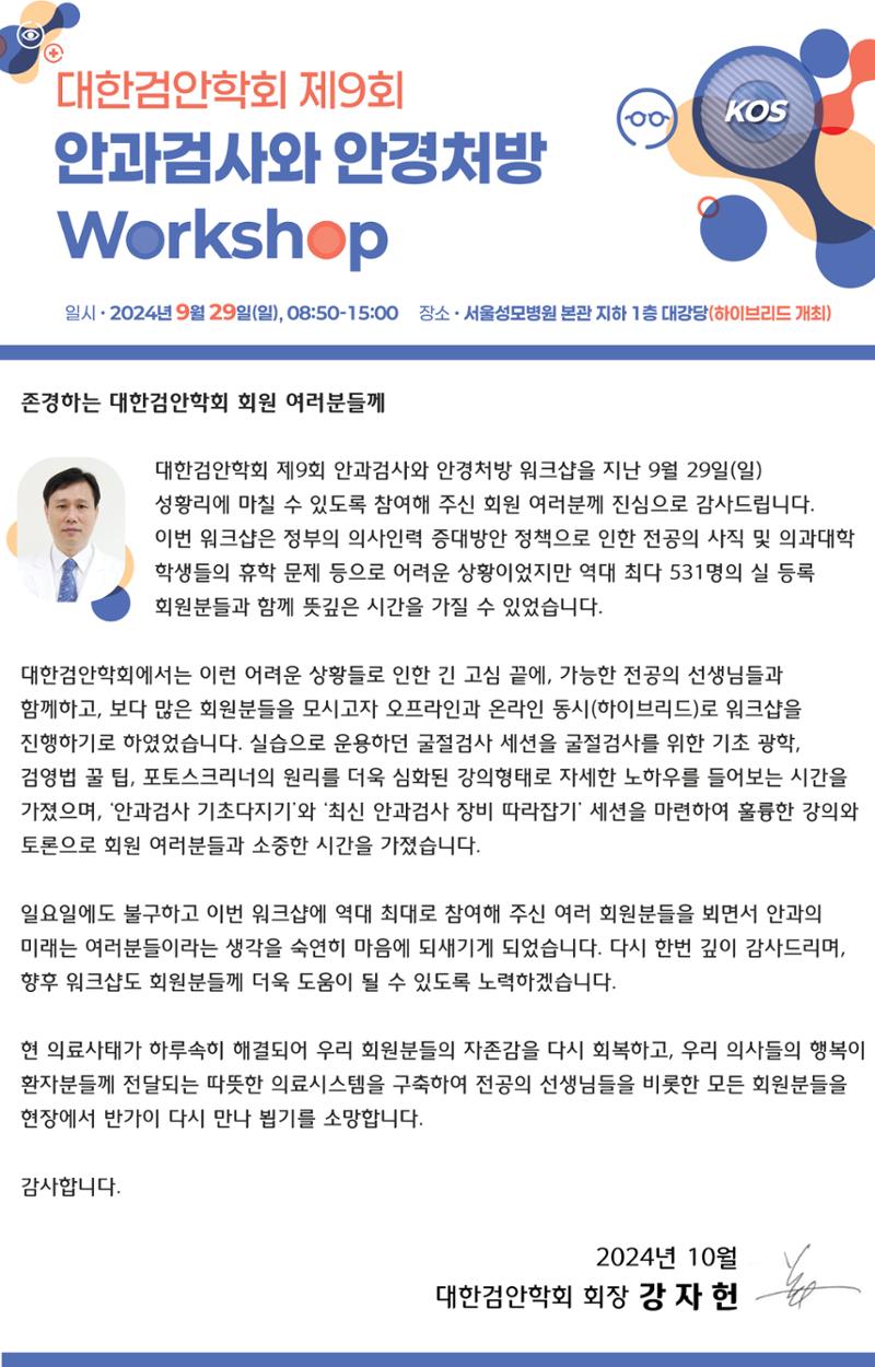 대한검안학회 제 9회 안과검사와 안경처방 Workshop 성료감사의 글